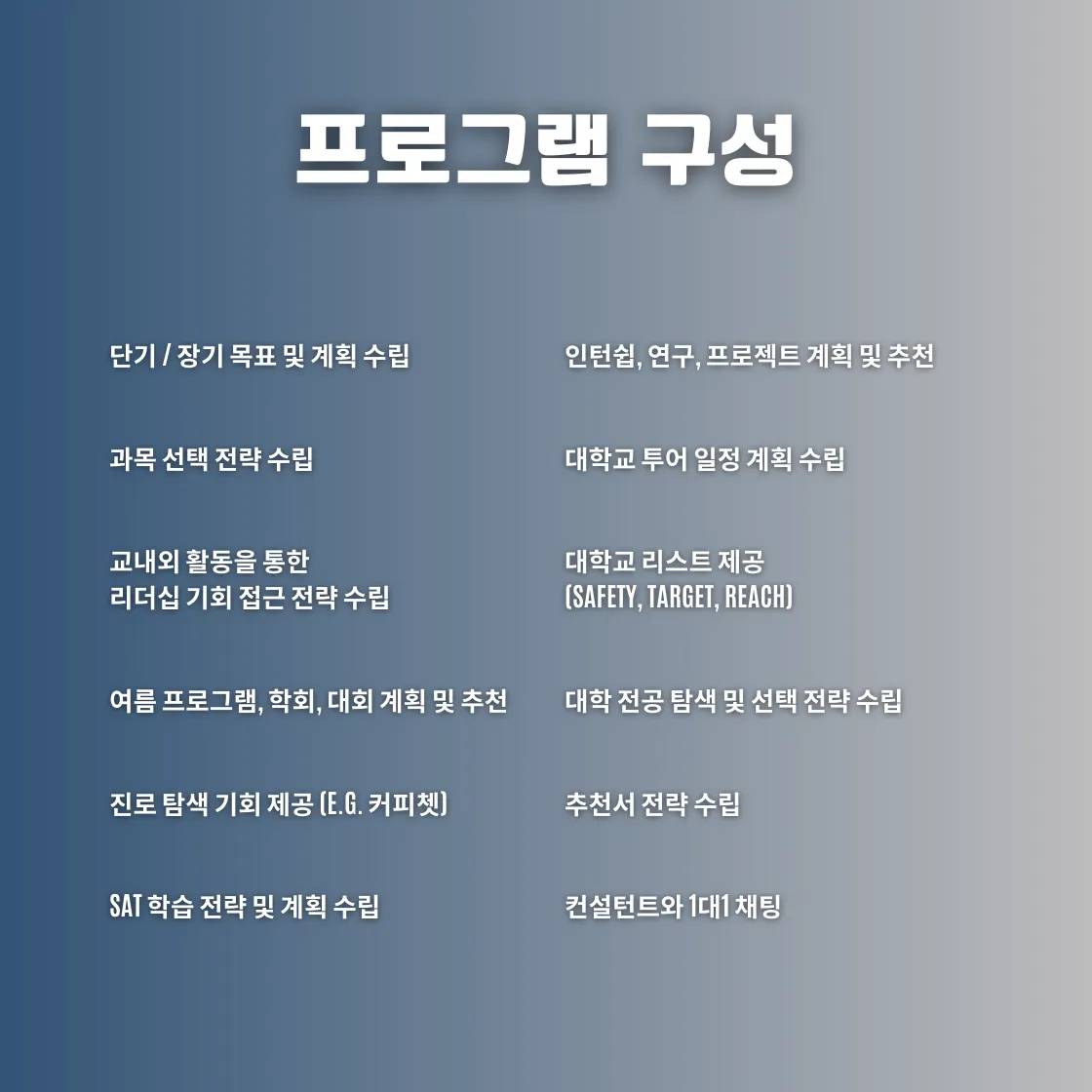 대부분의 입시 컨설팅은 환불이 어렵고, 정확히 무엇을 제공받는지 불투명합니다. 저희는 불필요한 거품을 과감히 걷어내고, 학생과 학부모님 모두가 안심할 수 있는 월별 플랜을 제공합니다.