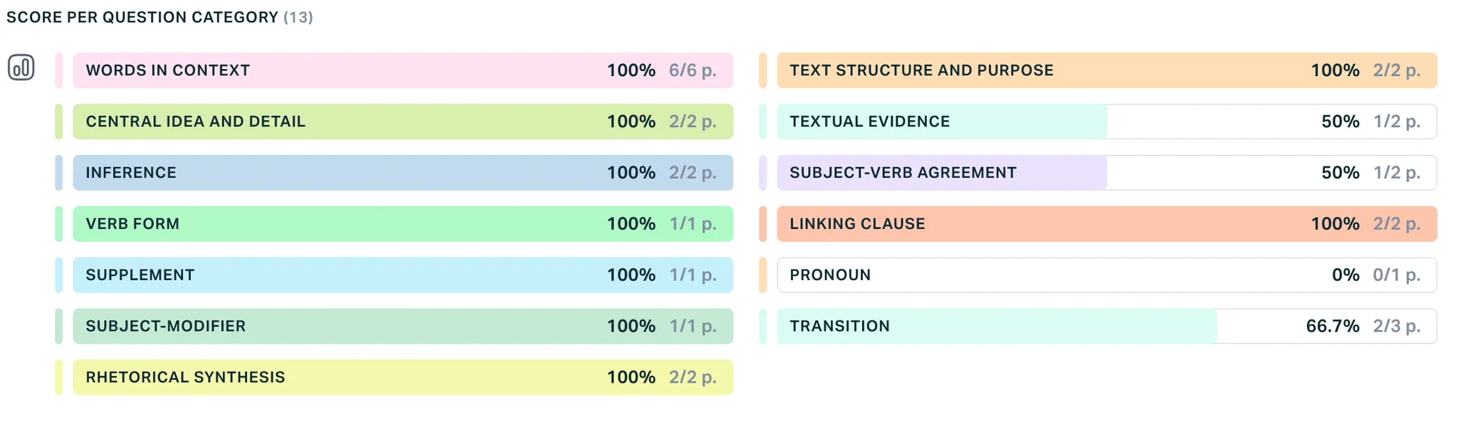 학생의 실력을 영역별(독해/문법, 수학)로 자세히 들여다봅니다.