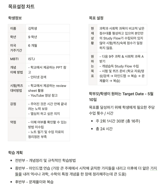 주어진 정보와 시범 수업 후 앞으로의 수업 진행 방식과 일정을 설정합니다.